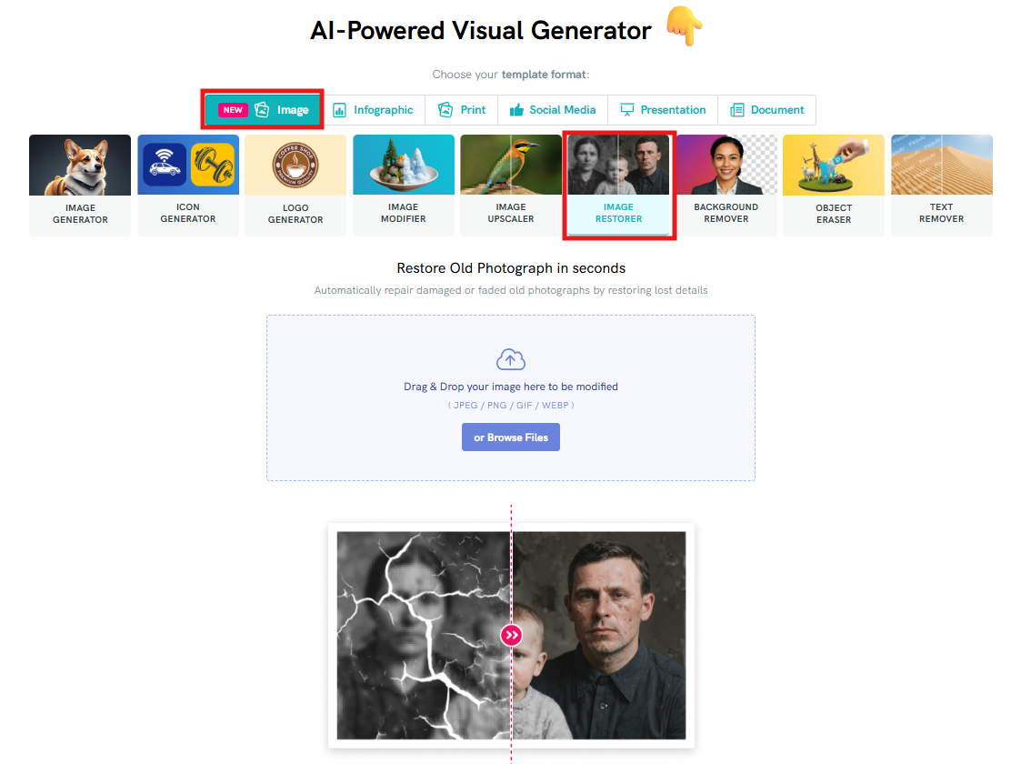 From your visual editor, go to the AI Tools panel. Under the AI Image Enhancer section, click on Image Restorer.