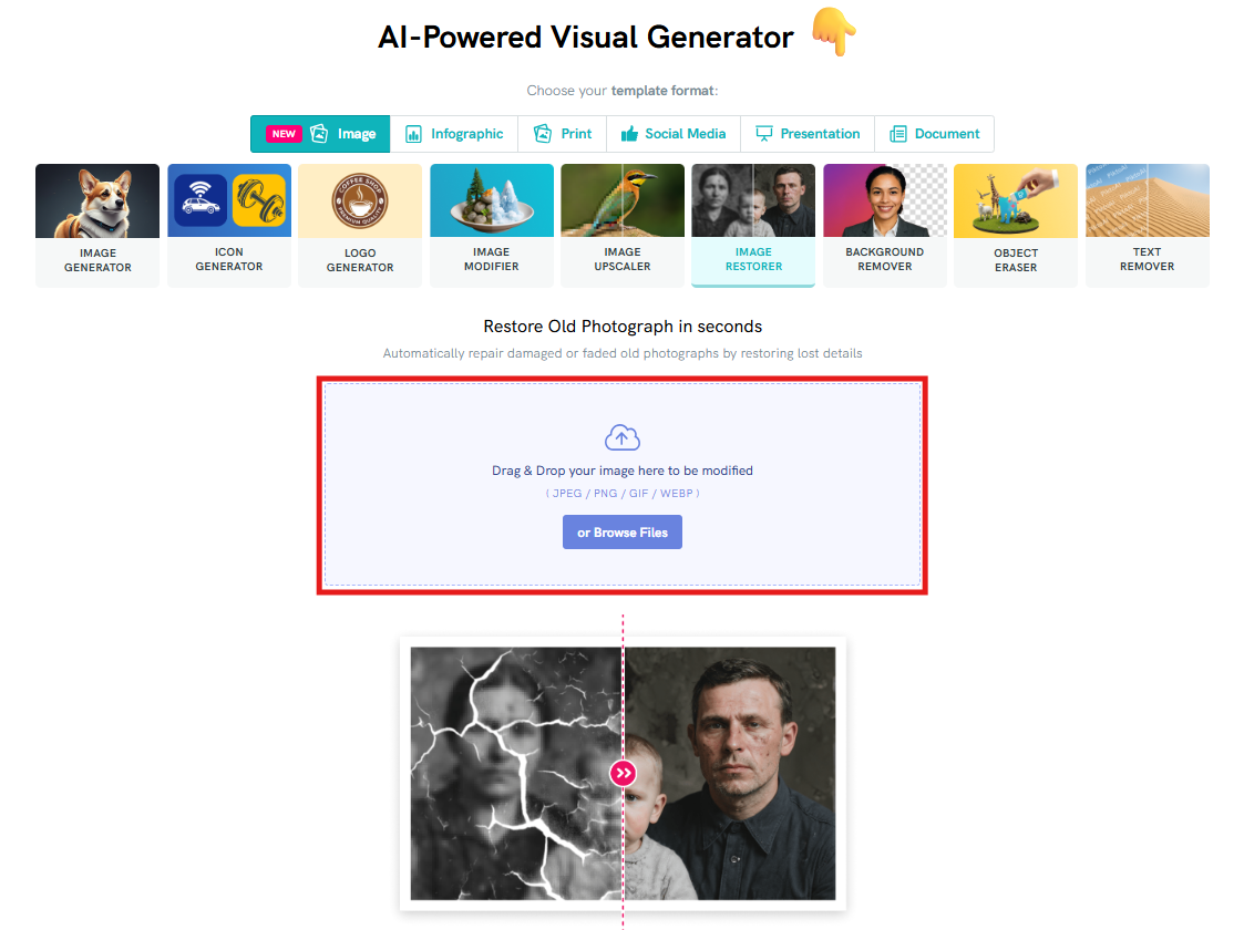 Yes! When you restore an image, Piktochart provides a side-by-side Before and After comparison on the left panel so you can visually assess the improvements made by the AI.