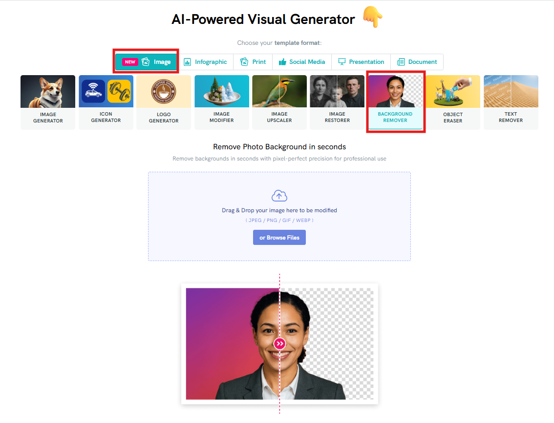 The Background Remover uses AI technology to automatically detect and erase the background from your selected image. It isolates the main subject and removes the rest, giving you a clean, transparent background in just one click — no manual editing required.