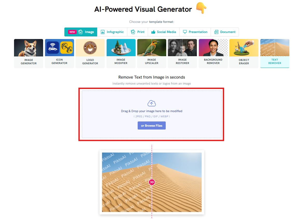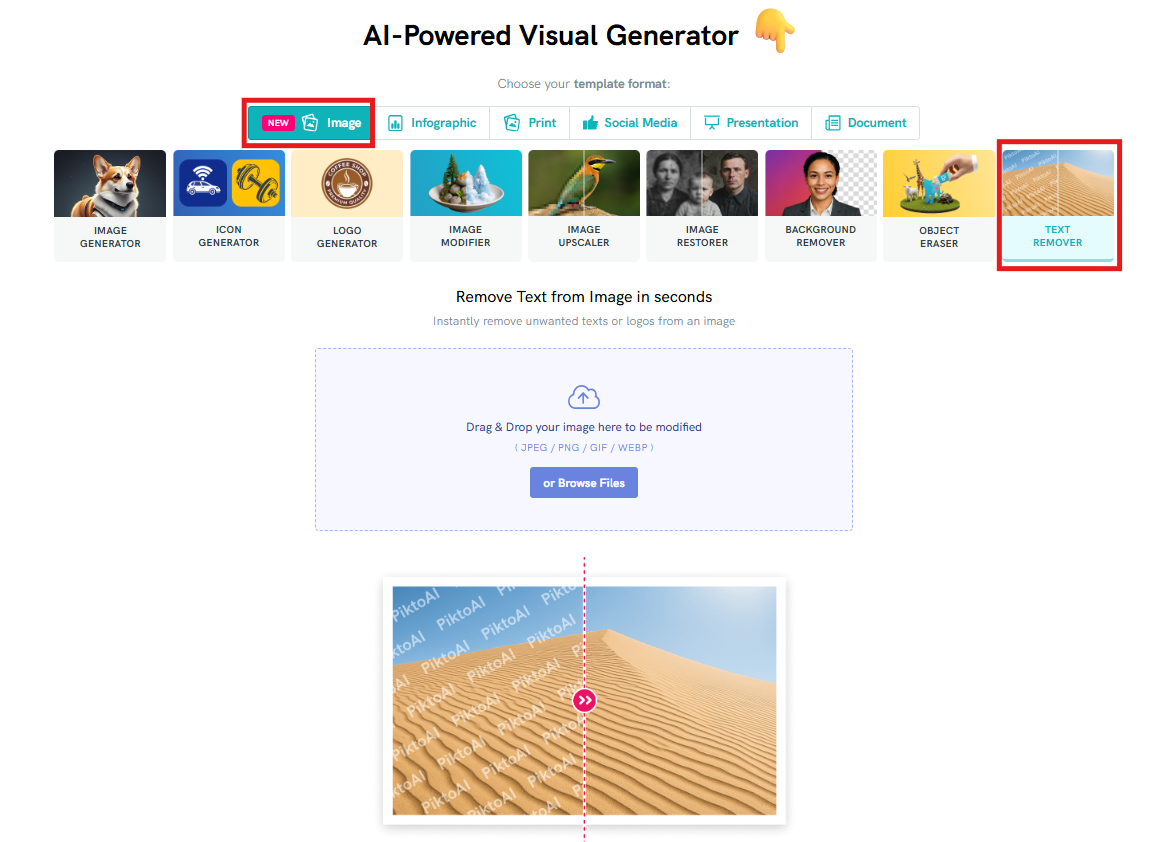 Pikto AI Text Remover is a powerful tool designed to streamline your image editing workflow. Using advanced AI technology, it automatically detects and removes watermarks, logos, text overlays, and repetitive patterns from images — no manual effort required. Whether you're repurposing content, preparing visuals for presentations, or enhancing product shots, this tool helps you achieve a cleaner, more professional look in seconds. Best of all, it preserves image quality while eliminating unwanted elements, making it easier than ever to create polished visuals ready for any platform.