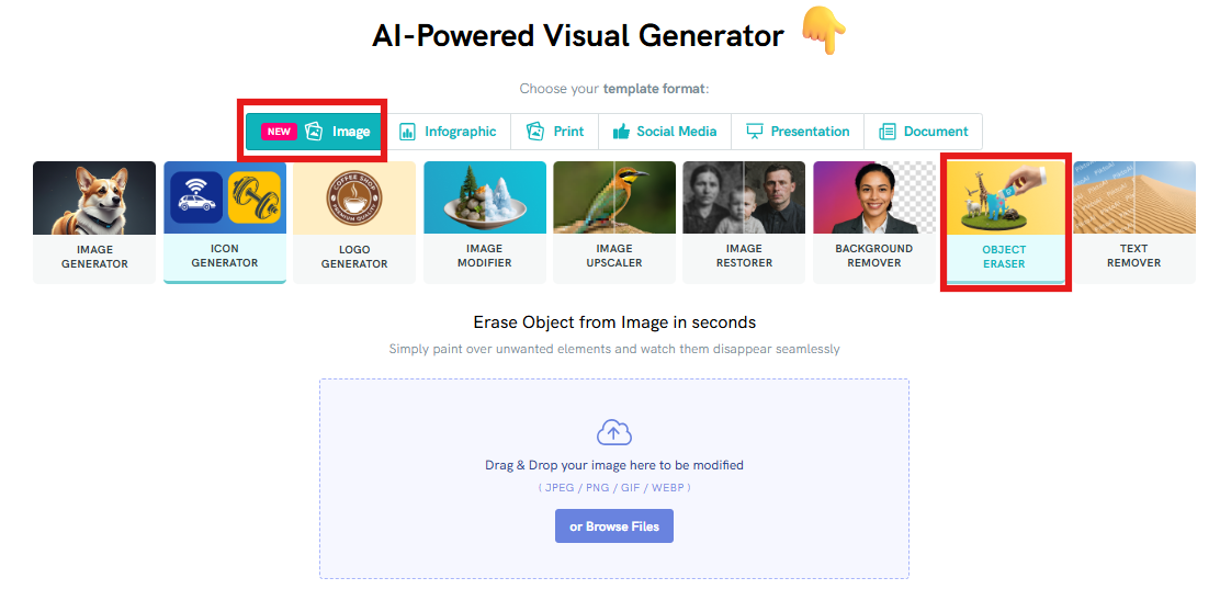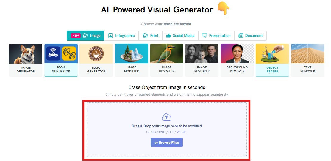Upload the image you want to modify by either dragging and dropping it into the upload area or clicking 'Browse Files' to select it from your device.