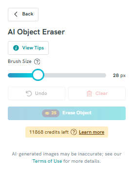 Yes, each object erasure consumes 25 credits for each generation. This is applied per erasure action, regardless of the object’s size or the amount of editing required.