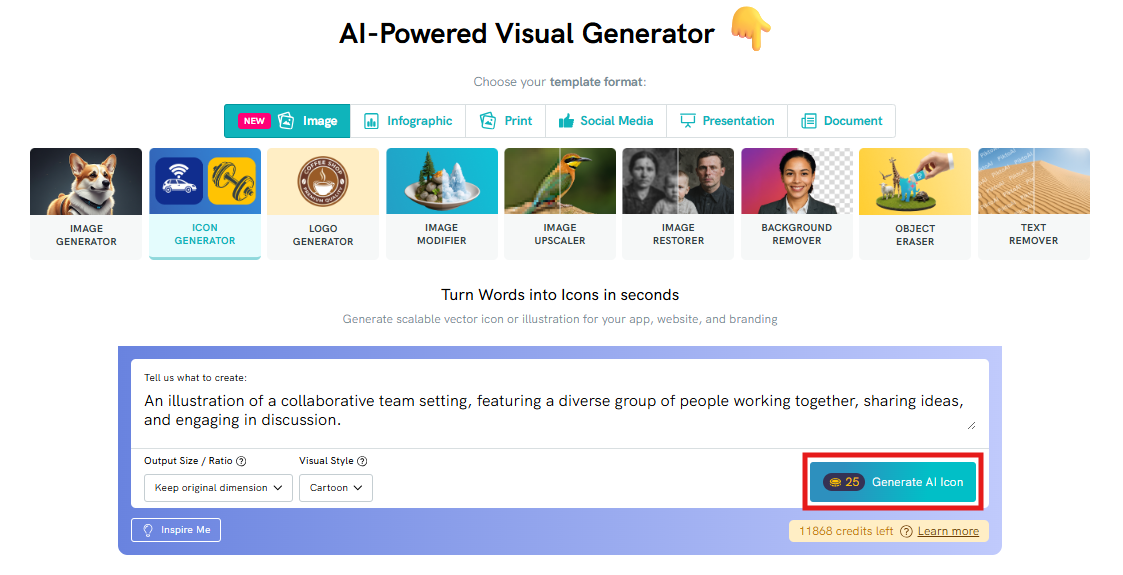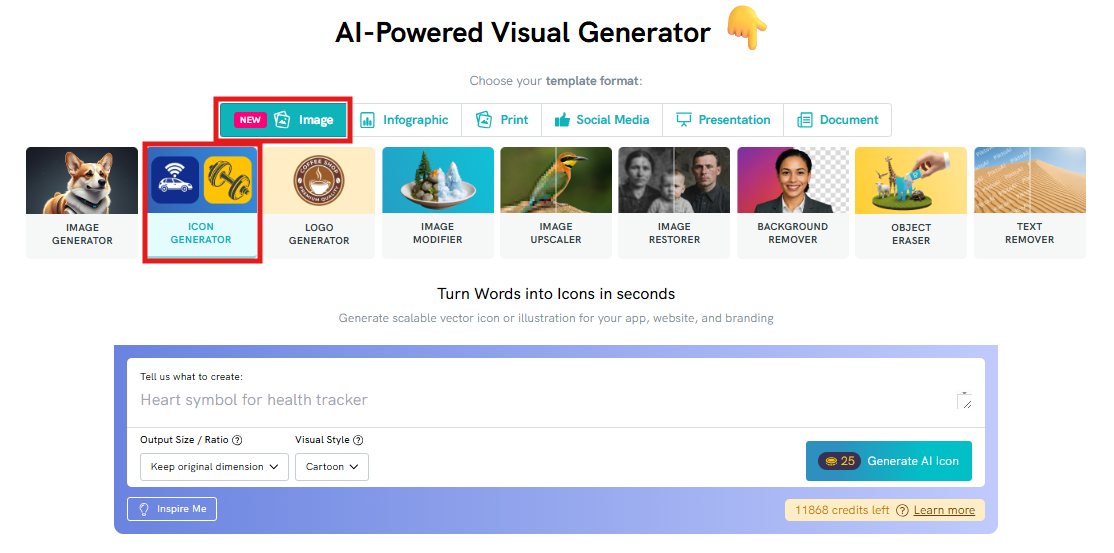 Click AI Tools from the left panel, then under AI Generator, select the Icon Generator option.