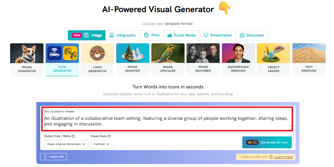 💡 You can use the “Inspire Me” button to generate a random AI prompt suggestion for you. AI will suggest a creative prompt that you can use as-is or modify to suit your vision.
