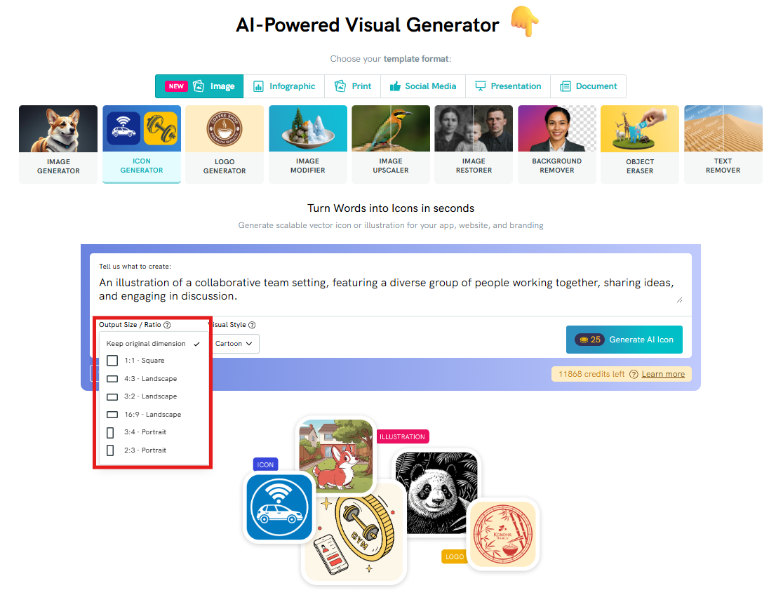 Set the size and ratio by choosing the appropriate dimensions such as square, portrait, or landscape.