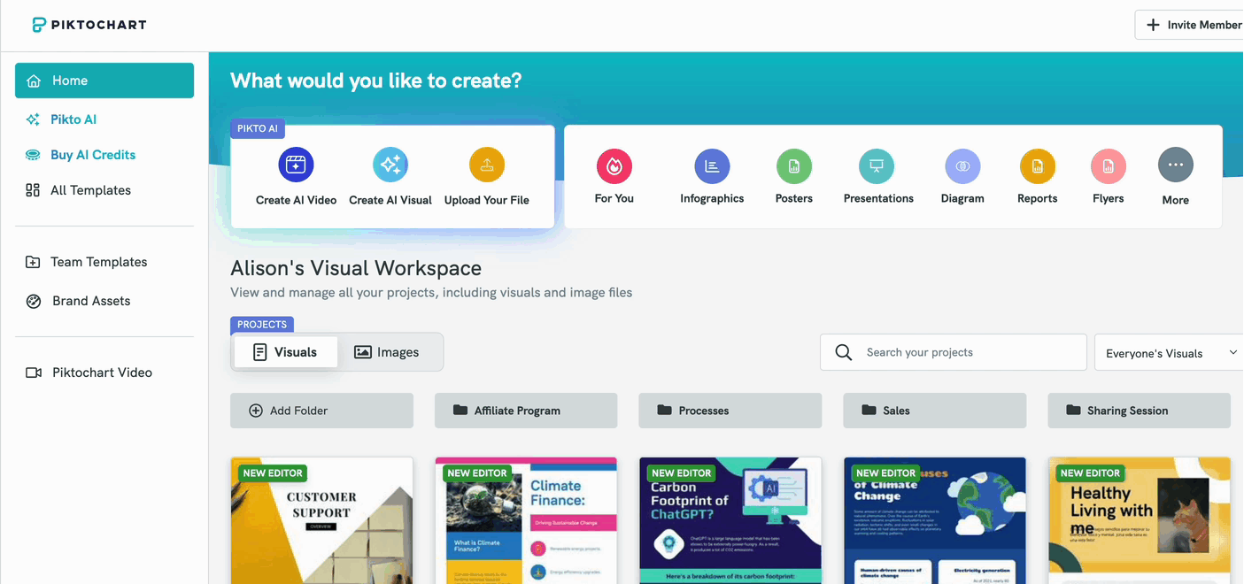 Once you've logged into Piktochart, you will first land on the Piktochart Visual Dashboard.