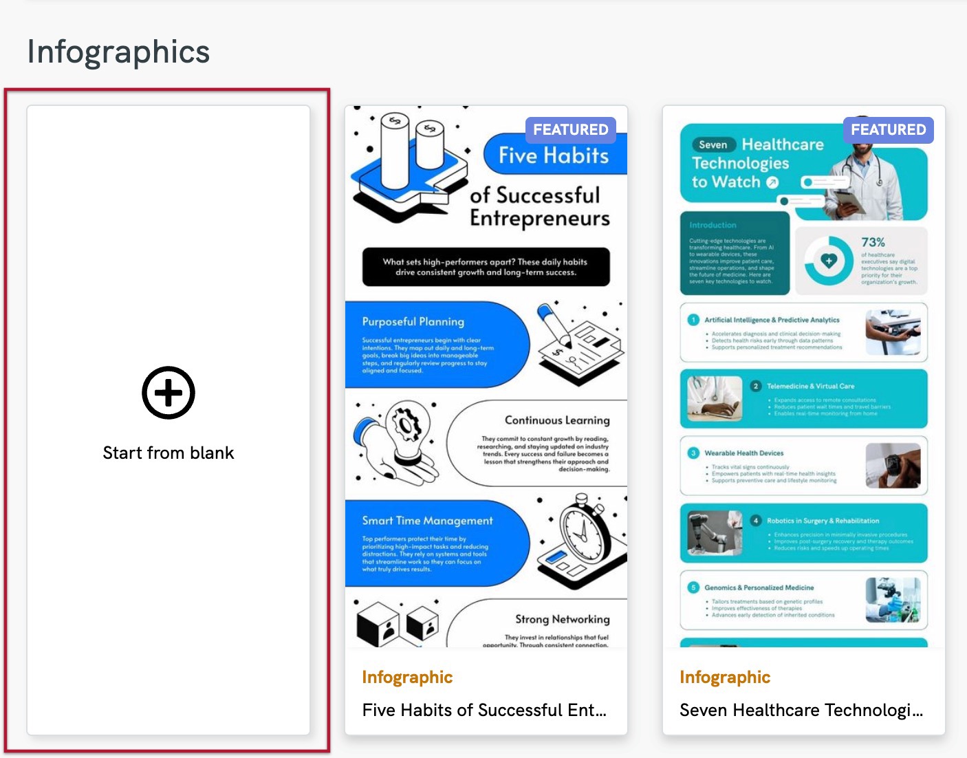 - Scroll through our pre-designed templates according to their respective formats - infographics, Presentation, Posters, Reports, and Flyers.