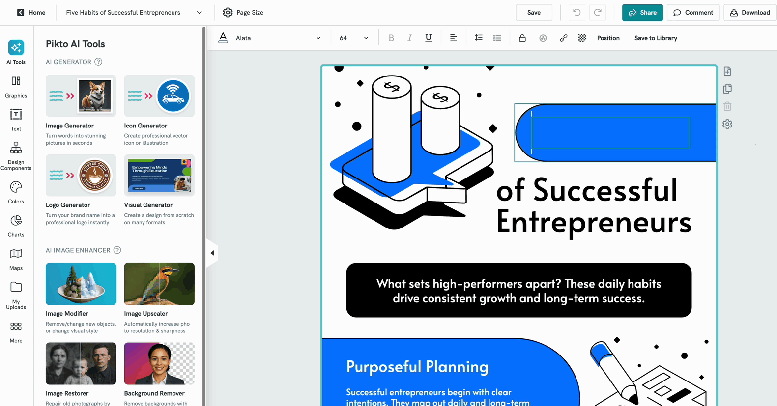 Piktochart includes AI tools to help you create visuals faster with Pikto AI.