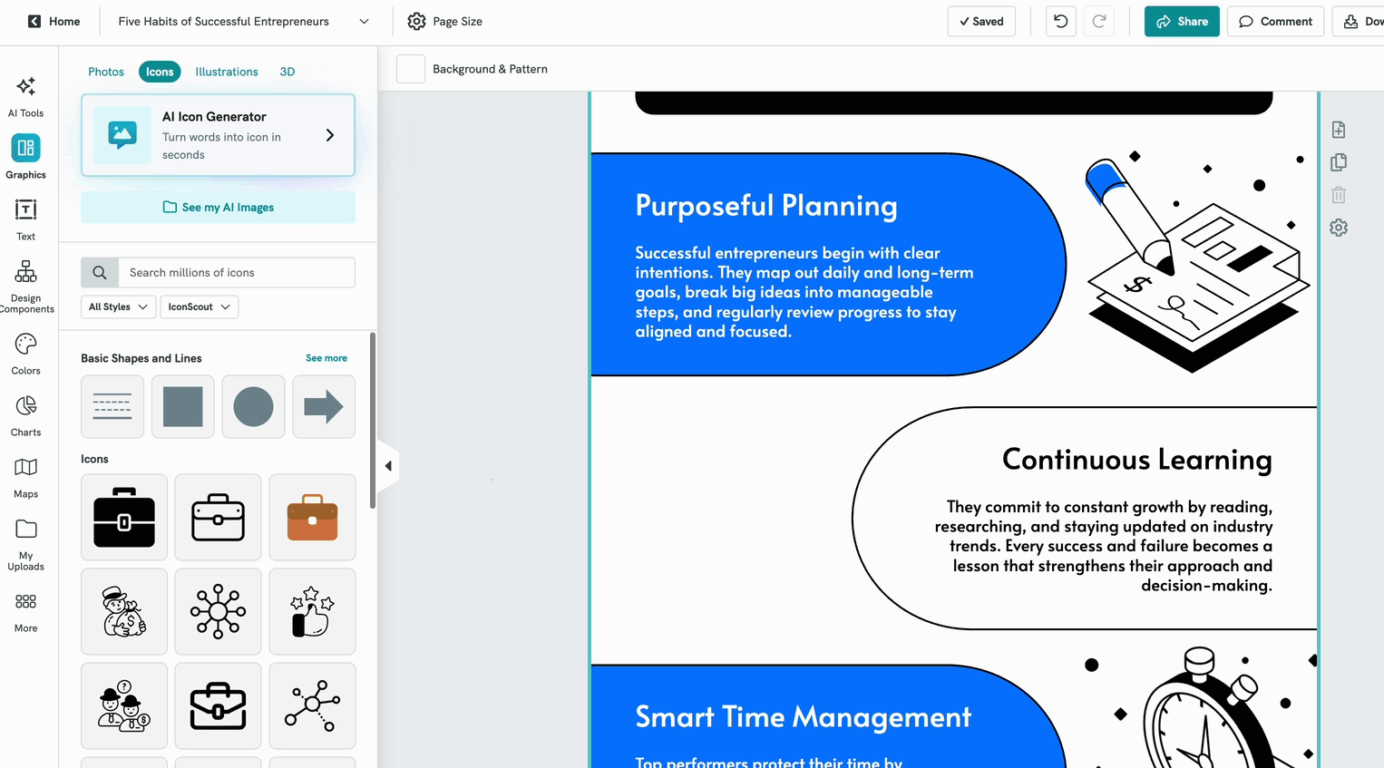 - Add graphics elements such as icons, photos, maps, charts and etc.