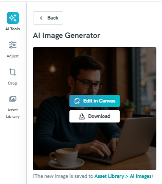 If you are satisfied with the generated image, download it to your device and/or click Edit in Canvas to add it on your visual: