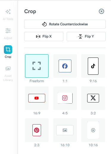 Crop your photo: Use the Crop tool to adjust the framing of your photo. You can rotate the image counterclockwise, flip it horizontally or vertically, and choose from a variety of preset aspect ratios. Select Freeform to crop freely, or pick a preset size such as 1:1, 9:16, 16:9, 4:5, 3:2, 2:3, 16:10, or 10:16—including popular formats for platforms like Facebook, TikTok, Instagram, YouTube, and Pinterest. This helps you quickly crop your image to fit the exact dimensions required for different uses or social media posts.